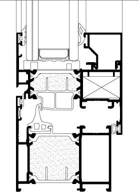Sistema de batente com profundidade de 64 mm dos aros fixos e de 72 mm das folhas, com três câmaras.