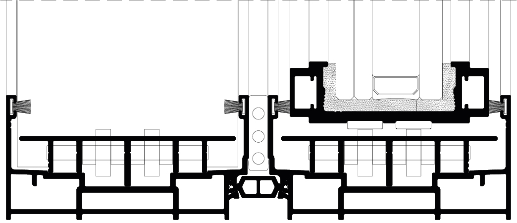 Sistema minimalista de caixilharia de correr, com vista em alçado de apenas 21 mm para o montante central, que permite, através da utilização de vidro estrutural, a execução de vãos de grande dimensão, nas versões mono-rail, bi-rail e tri-rail.