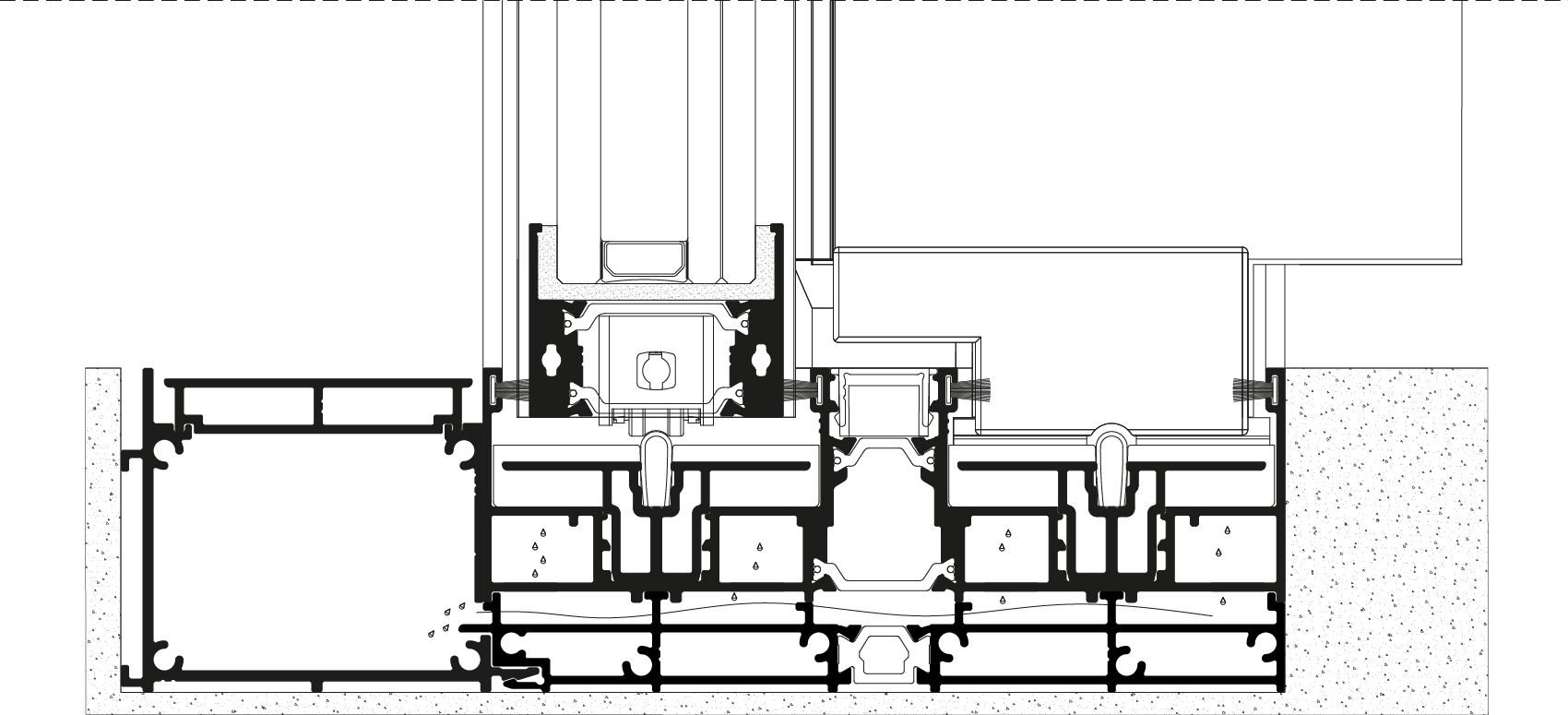 Sistema minimalista de caixilharia de correr, que mantém a mesma vista em alçado de 26,5 mm para o montante central, que permite, através da utilização de vidro estrutural, a execução de vãos com peso de até 300 kg por folha.